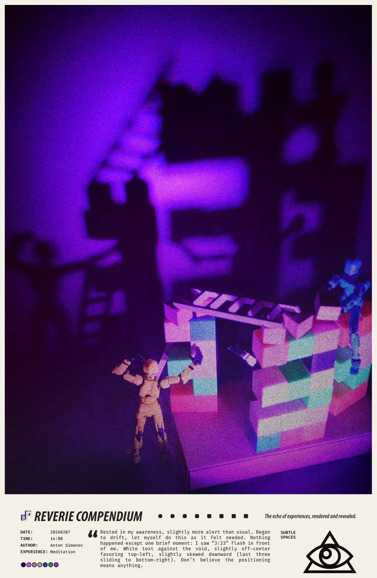 Rested in my awareness, slightly more alert than usual. Began to drift, let myself do this as it felt needed. Nothing happened except one brief moment: I saw “3:33” flash in front of me. White text against the void, slightly off-center favoring top-left, slightly skewed downward (last three sliding to bottom-right). Don’t believe the positioning means anything.