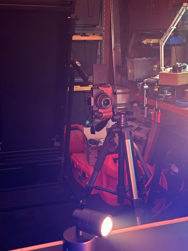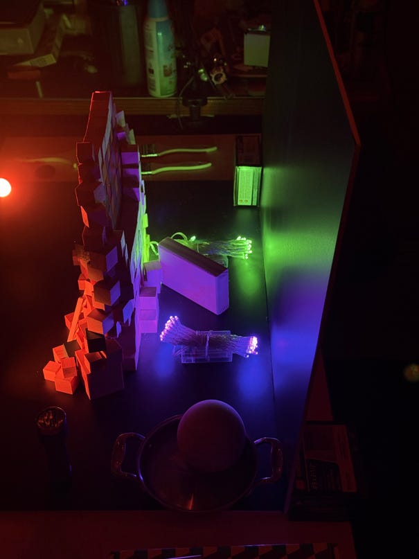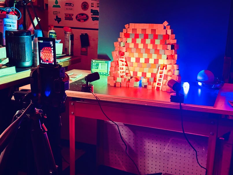 For this piece, the prep or rather the subject-creation took on another aspect. I decided to throw together a makeshift shadowbox rig out of one of my shop’s metal carts, foam core boards, and LED lights (including a Hank Light, also known as Emisar). For the main composition, I used 1” wood blocks, natural and colored. I also had a few varying sized blocks around and a couple tiny ladders for tiny people.