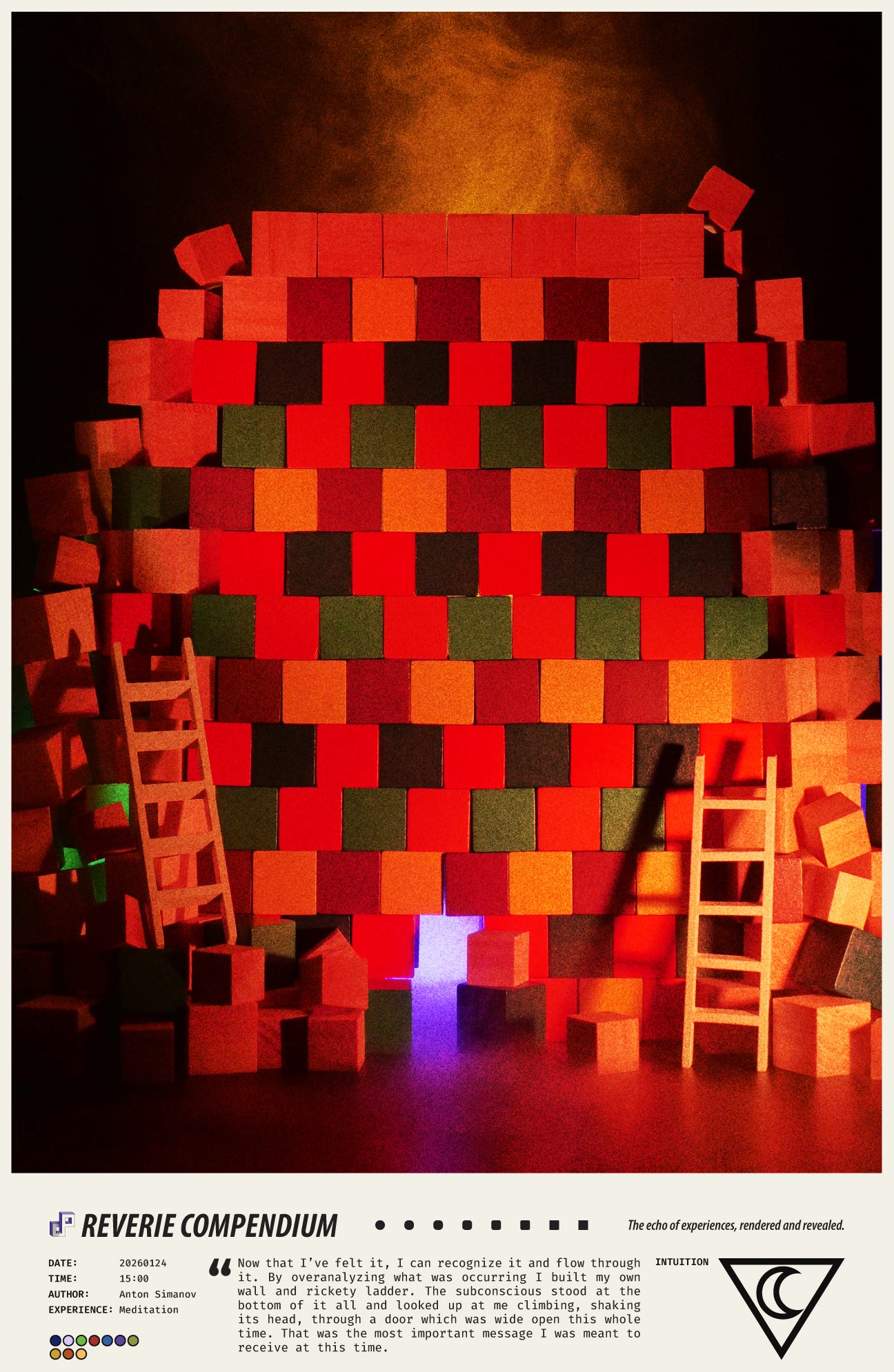 Now that I’ve felt it, I can recognize it and flow through it. By overanalyzing what was occurring, I built my own wall and rickety ladder. The subconscious stood at the bottom of it all and looked up at me climbing, shaking its head, through a door which was wide open this whole time. That was the most important message I was meant to receive at this time.